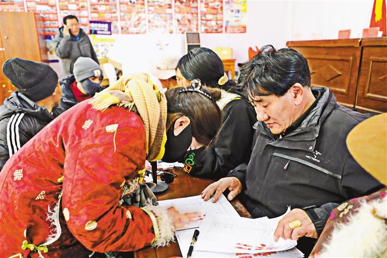圖為圓夢新居社區群眾有序排隊、簽字、按手印,準備領取分紅。 記者 達珍 永青 攝