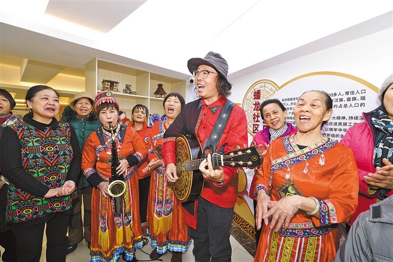 “蟠龍社區生活著漢族、壯族、瑤族等15個民族的同胞,少數民族人口約占社區總人口的1/3。”蟠龍社區黨委副書記許玉君介紹說,社區結合多民族“嵌入式”居住的特點,創新踐行“136”工作機制,即圍繞鑄牢中華民族共同體意識這條主線,通過加強黨的領導、織牢精神紐帶、用好治理平臺“三個抓手”,積極創造各民族共居共學、共建共享、共事共樂的“六共”條件,讓各族群眾像石榴籽一樣緊緊抱在一起。“我是漢族,會做壯族的特色菜,我愛人是仫佬族,漢字書法練得有模有樣。”蟠龍社區藝術團骨干何繼榮老人說。