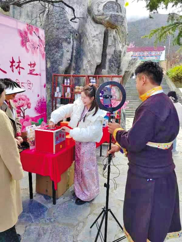 林芝市職業技術學校學生在嘎拉村直播,宣傳推介桃花旅游文化節、工布民俗風情及農特產品等。 記者 謝筱純 王珊 攝