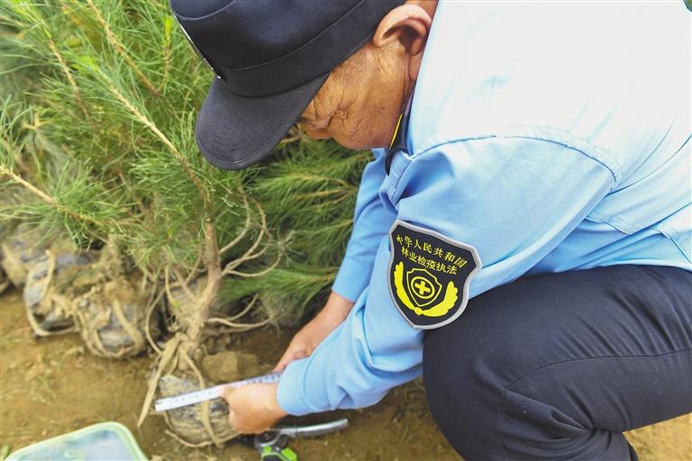 在拉薩南北山綠化工程2024年度鞏固提升(貢嘎機場周邊山體)工程項目上,林業檢疫執法工作人員在檢查樹苗根部土球是否達標。 新華社記者 晉美多吉 攝
