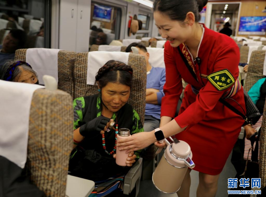 拉薩開往日喀則C885次列車長為旅客送開水。新華社發(馬生明 攝)