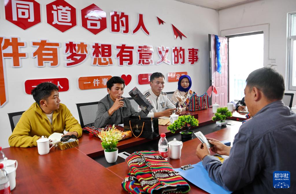 倉秋多吉(左二)和團隊核心成員商討產品銷售提升策略(8月24日攝)。新華社記者 張汝鋒 攝