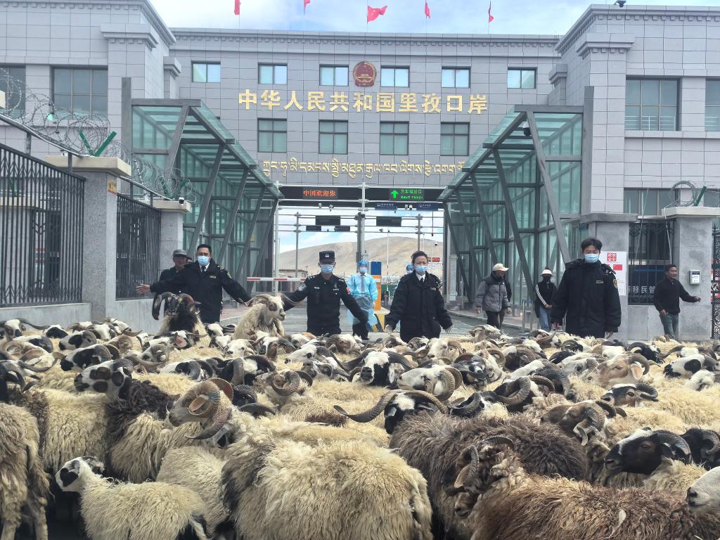 日喀則海關工作人員在里孜口岸監管活羊出口。(受訪者供圖)