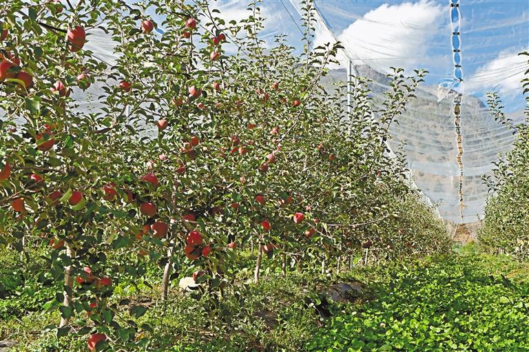 矮砧寬行密植的蘋果樹被劃分成一個個區域。“這是我們的多功能網室,是一種以高密度聚乙烯為主料的防護網。能抗大風,減少冰雹、暴曬等惡劣天氣帶來的影響。”增巴村蘋果種植基地技術員劉傳海介紹道。