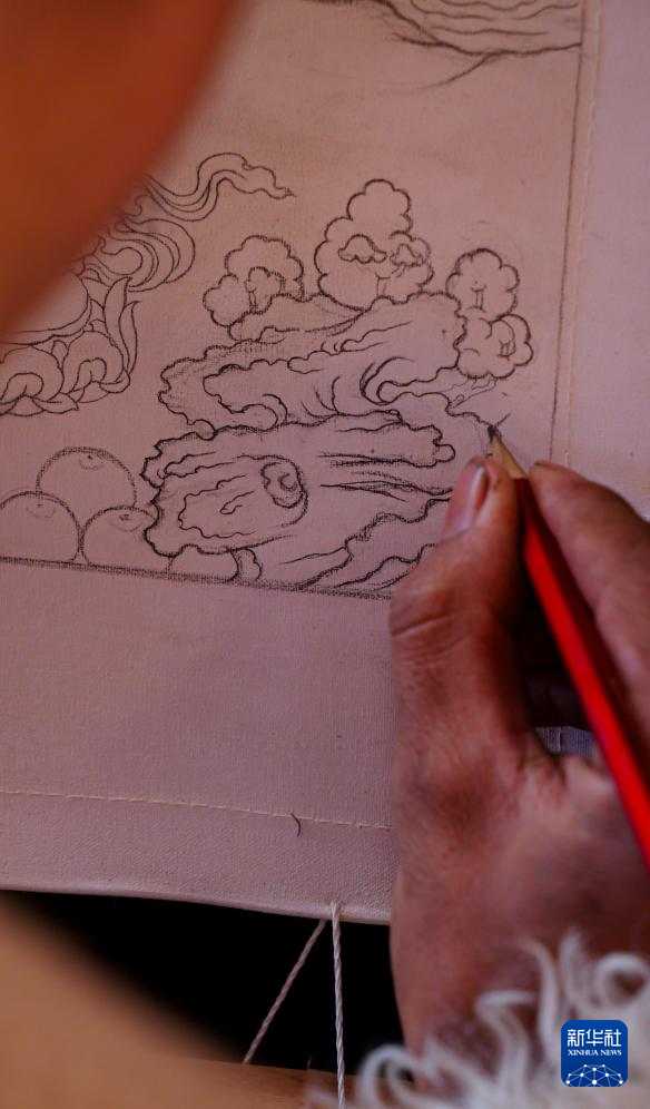 11月22日,昌都市丁青縣擁忠文化藝術中心非遺扶貧就業工坊學員在畫唐卡。新華社記者 格桑朗杰 攝