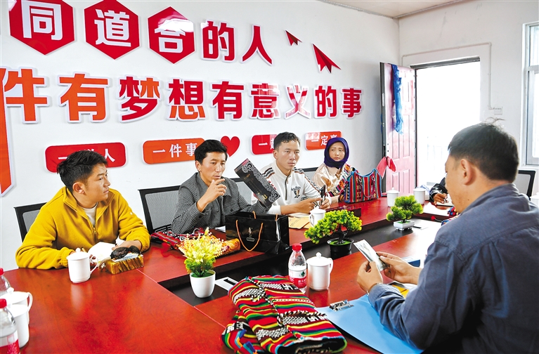 那曲市安多縣的大學畢業生倉秋多吉聯合6人創業,于2021年創辦了安多托尕爾倉游牧產業有限責任公司。公司搭建了民族手工藝產品、土特產銷售平臺,在當地政府優化營商環境政策的支持下,創業團隊逐步擴大,帶動了當地農牧民產業興旺。 圖為倉秋多吉(左二)和團隊核心成員商討產品銷售提升策略。(資料圖片) 新華社記者 張汝鋒 攝