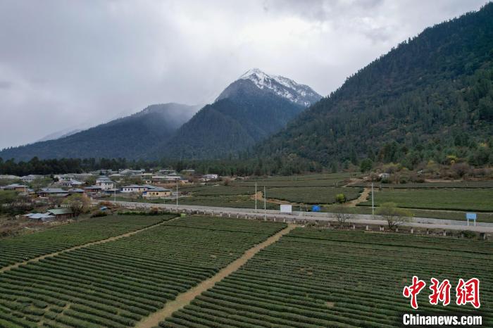 12月13日,西藏林芝波密縣易貢茶場雪山、茶田風光。(無人機畫面)中新社記者 江飛波 攝