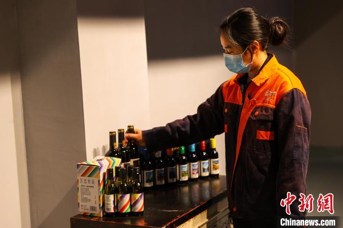 芒康縣在種植葡萄方面有著悠久的歷史,因干熱河谷氣候優勢明顯,紫外線強、光線充足,適宜大面積栽種無公害綠色釀酒葡萄。圖為工作人員檢查瓶儲區葡萄酒狀態。中新社記者 薛蒂 攝