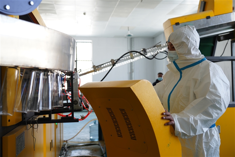 霞崗江實業公司工作人員操作飲用水產品包裝設備。記者 洛桑旦增 達珍 攝