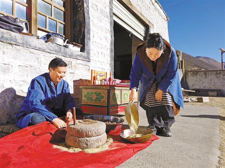 洛桑與曲旺用石磨研磨制作藏香所需的藏藥材。