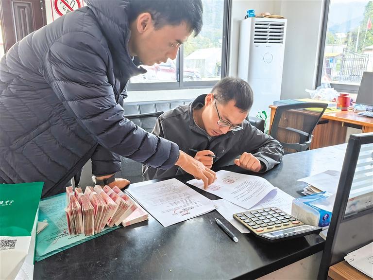 墨脫縣新創農業科技開發公司工作人員為波東村種植戶結算靈芝款。圖/文 記者 王珊 劉楓