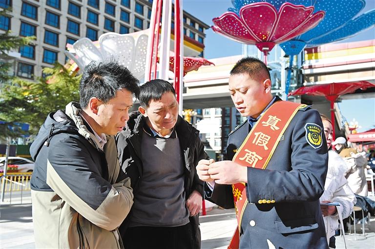 圖為桑珠孜區市場監管局投訴舉報中心負責人李良友(右)向市民講解商品真假辨別方法。記者 扎西頓珠 攝