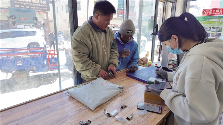 近日,日喀則市定日縣長所鄉森嘎村災后重建工地上的幾位工人,相約來到該村受災群眾安置點入口處的郵政網點取快遞,這是個設在活動板房里的臨時網點,營業員尼瑪次仁認真核對信息后從提貨架上將幾個快遞取下交到他們手上。