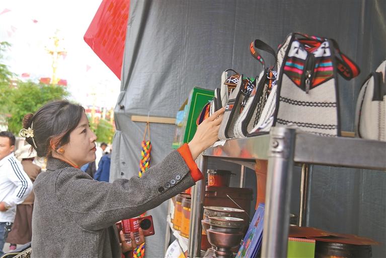 圖為曲松縣農(nóng)產(chǎn)品展銷活動(dòng)中,具有當(dāng)?shù)靥厣氖止ぞ幙棶a(chǎn)品深受青睞。記者 丹增平措 攝