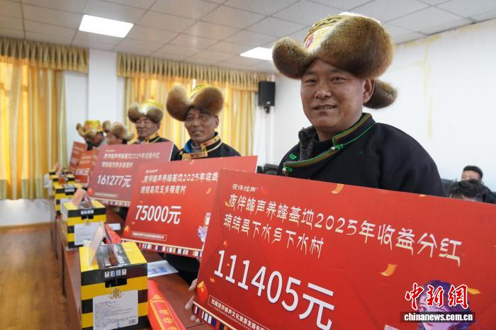 瓊結(jié)縣拉玉鄉(xiāng)強(qiáng)吉村黨總支書記、村委會(huì)主任赤列旺久反復(fù)數(shù)著一疊又一疊的現(xiàn)金說:“今年分紅75000元。相較于出遠(yuǎn)門打工掙錢,在家門口養(yǎng)蜂更踏實(shí),收益更好。”