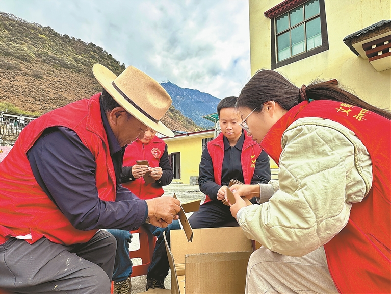 圖為墨脫縣格當鄉黨員干部幫助村民制作包裝盒。記者 王敏 通訊員 郎玲 攝