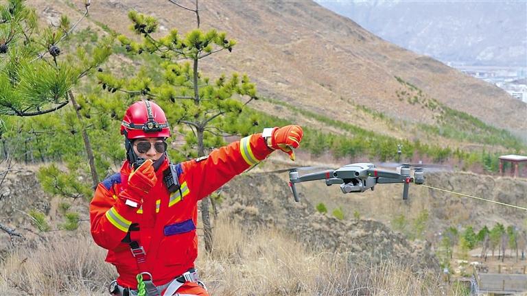 圖為拉薩市消防救援隊伍利用無人機開展偵察測繪、喊話照明、物資投送等集群化作業。