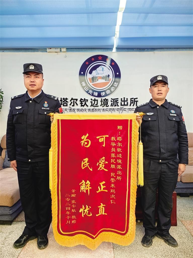 2024年10月12日,日喀則邊境管理支隊扎西宗邊境派出所收到了北京游客楊先生寄來的錦旗,錦旗上印著“長的帥 破案快 真衛士 保平安”。楊先生通過這樣的方式,對扎西宗邊境派出所民警快速反應、專業執法和熱情服務表示衷心的感謝。