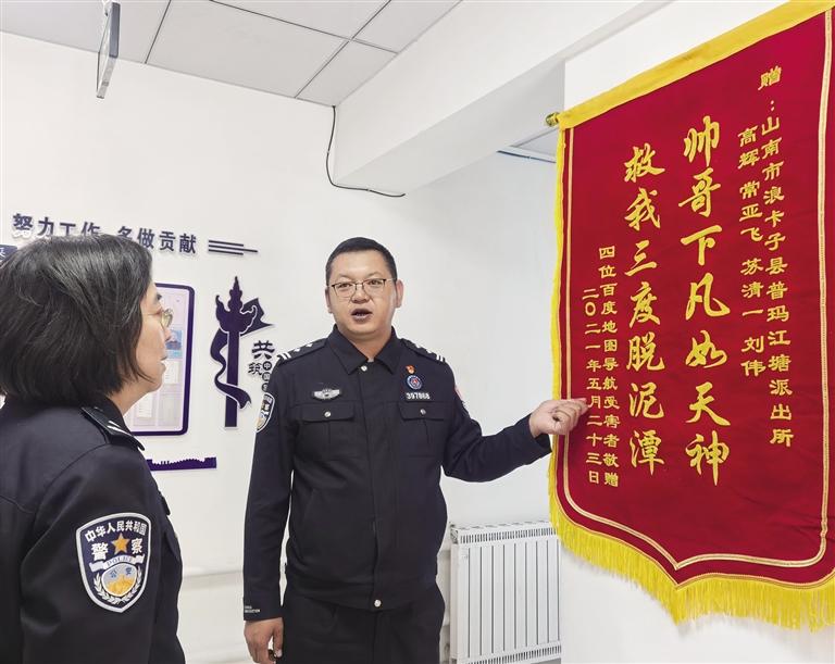 “帥哥下凡如天神,救我三度脫泥潭!”如果錦旗有生命,憑借這兩行字,它無疑會成為最引人注目的那一個。這面特別的錦旗存放在山南市邊境管理支隊普瑪江塘邊境派出所的榮譽室里。2021年5月,普瑪江塘邊境派出所接到求助電話,稱4名游客駕車前往崗布冰川被困沼澤,亟待救援。接警后,民警迅速到達現場進行救援。游客脫險后千恩萬謝,與民警互留電話。民警叮囑他們趕緊離開,不要再去冰川了。然而走了還不到5分鐘,民警又接到電話,稱他們再次駕車陷入泥沼動彈不得。警車原路返回,進行救援。然而民警剛離開10分鐘,再次接到了游客電話:“警官,非常不好意思,我們又陷進去了還得麻煩你們再回來一趟。”于是,這面“救我三度脫泥潭”的錦旗便誕生了。
