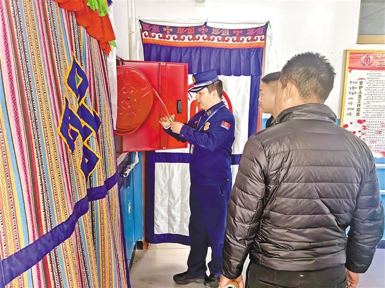 林芝市墨脫縣消防救援大隊宣傳人員檢查養老機構微型消防站的消防器材。 通訊員 才旺多吉 攝