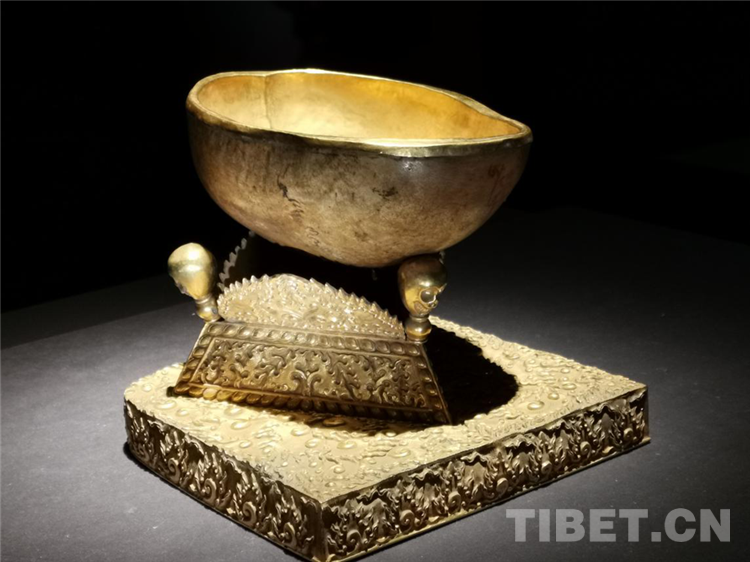 嘎巴拉碗配金質碗蓋、托座及底板。碗托座為有底三角形,束腰上焊有三個小骷髏頭,外壁飾有火焰紋。托座底部刻有藏、滿、蒙古、漢四體文字“大清乾隆敬制”。梯形底板表面周鏨海水江崖及螺旋式火云紋,之下亦有四體“說語”。此碗為六世班禪于乾隆四十五年十月二十七日于寧壽宮念經時進獻,原藏于寧壽宮。