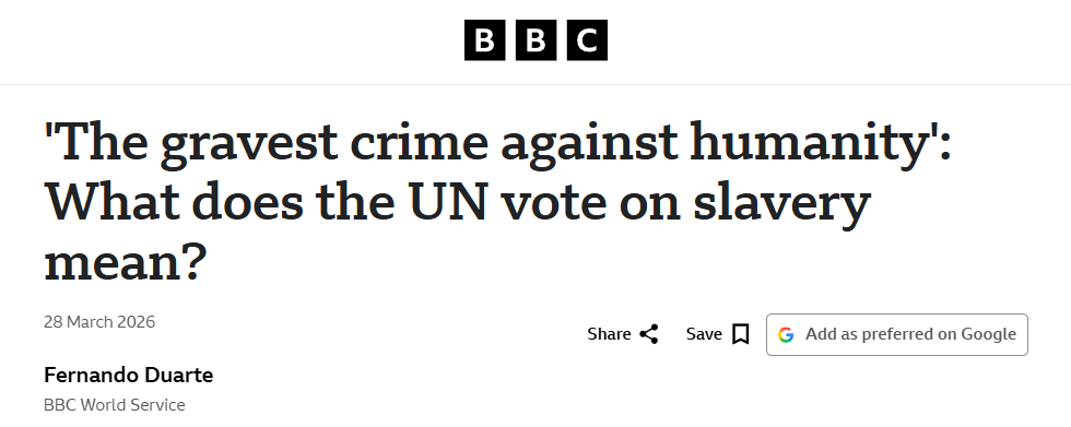 英國廣播公司網站3月28日刊登題為《“最嚴重的反人類罪”:聯合國關于奴隸制的表決意味著什么?》的報道。報道稱,聯合國大會近日以壓倒性多數通過了一項決議,認定跨大西洋奴隸貿易為“最嚴重的反人類罪”。