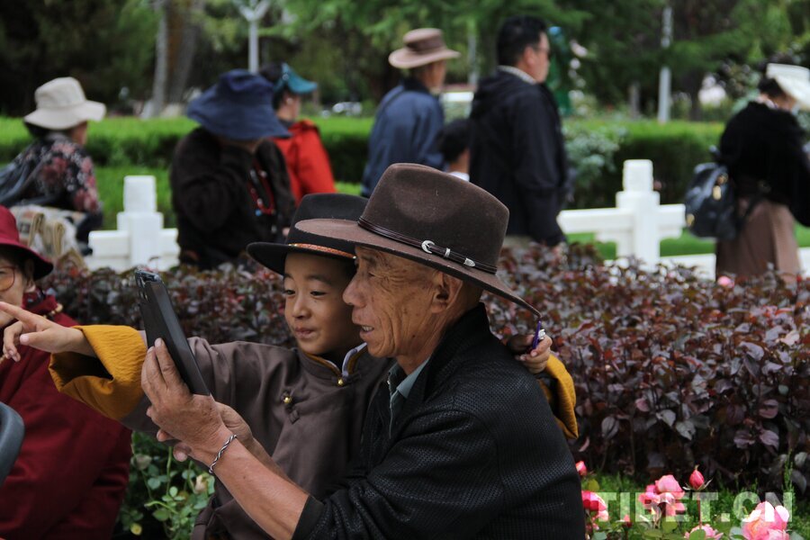 2025年8月24日雪頓節,拉薩市的藏族爺孫倆在羅布林卡享受節日時光。攝影:趙釗