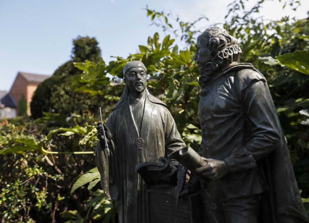2022年4月20日在英國(guó)斯特拉特福拍攝的莎士比亞和湯顯祖的青銅塑像。新華社記者 韓巖 攝