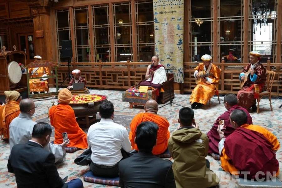 當晚,參訪團聆聽了中國非物質文化遺產“古爾魯”道歌。該藝術第42代傳承人——羊日崗寺第七世帕洛活佛以搖鼗伴奏,旋律源于誦經曲調,悠揚動人。參訪團成員們或靜心聆聽,或用視頻記錄下演奏的精彩時刻,完成了一次跨越語言與國界的音樂交流。