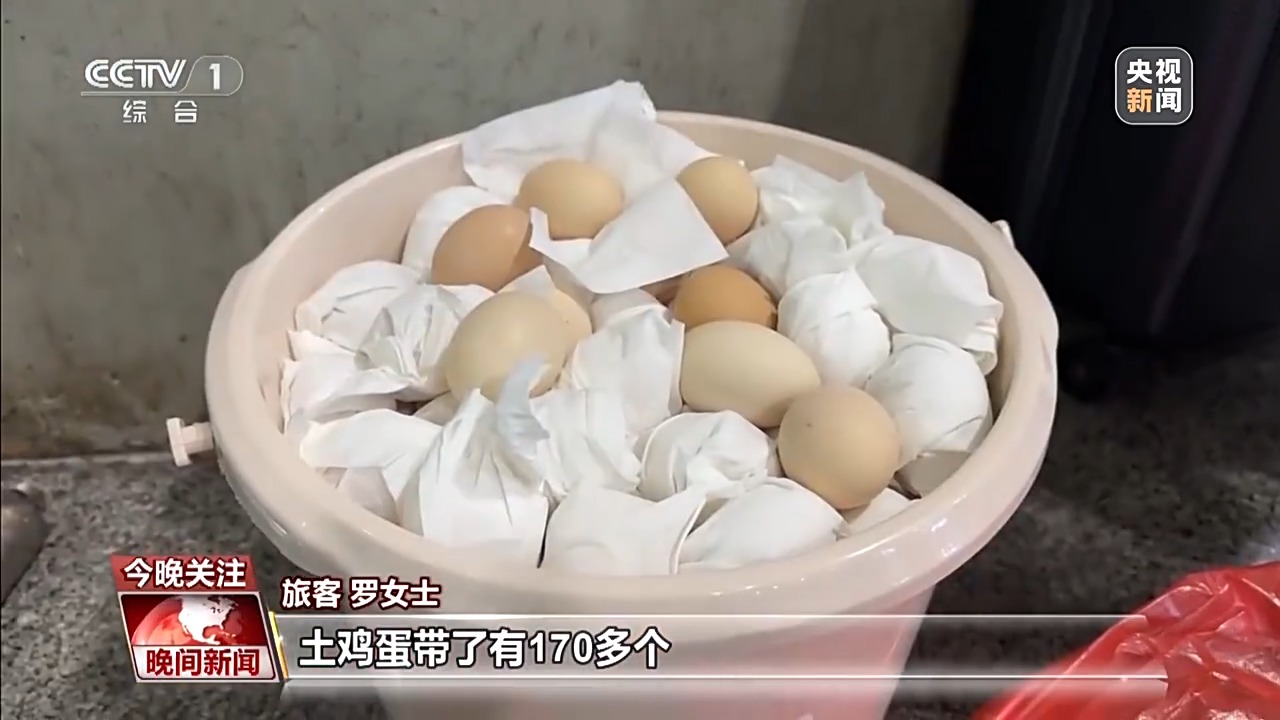 旅客 羅女士:土雞蛋帶了有170多個,給兒媳婦還有女兒,她們每一個拿點,她們都在成都上班。老家帶過來的土雞蛋,味道不一樣,吃起來香嘛。