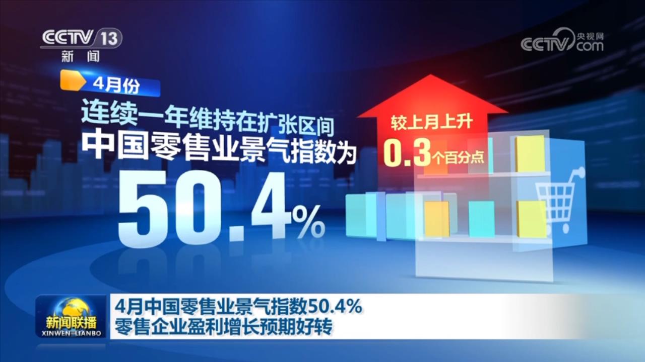 中國商業聯合會最新發布的中國零售業景氣指數顯示,4月份,中國零售業景氣指數為50.4%,較上月上升0.3個百分點,連續一年維持在擴張區間。從行業分類看,商品經營類指數、租賃經營類指數、電商經營類指數,較上月均有上升。