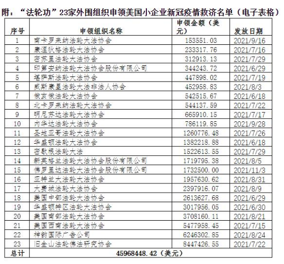 據美國小企業管理局網站公布新冠疫情期間“關閉場館運營商救濟金”申領名單,截至2022年7月5日,23個替“神韻演出”斂取錢財的美國“法輪功”外圍組織,共計套現美國政府新冠疫情救濟金高達近4600萬美元(約合人民幣3.12億元),超過法定限額近3600萬美元。