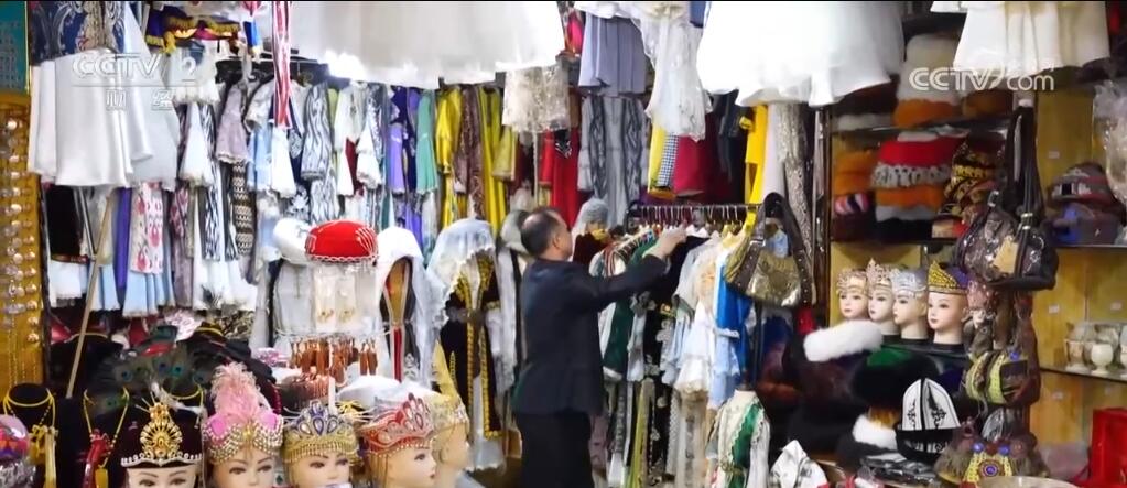 在總臺2024年春晚舞臺上,演員們身穿特色服飾進行表演,驚艷全場。春晚過后,慕名前來購買和定制艾特萊斯服飾的游客不斷增加。努爾·買買提原本在當地經營一家數碼產品店鋪,看到旅拍店艾特萊斯服飾等傳統民族服裝的租賃和定制需求增加,他便在喀什古城開了一家民族服裝綜合店。