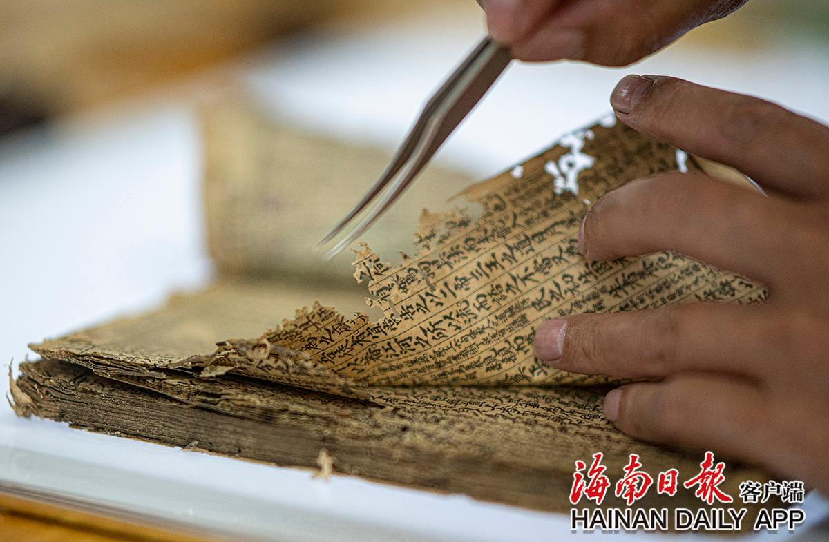 黃文鋒在查看古籍紙張破損情況。海南日?qǐng)?bào)記者袁琛 攝