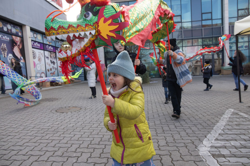 2024年2月3日,一名女孩在匈牙利布達佩斯唐人街的新春廟會上體驗舞龍。