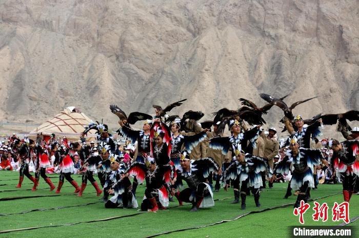 近日,2024年新疆阿合奇縣獵鷹文化旅游季拉開帷幕,活動現場獵鷹手與舞蹈演員共同演繹獵鷹舞。陶拴科 攝