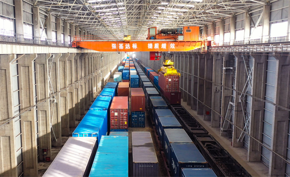 在新疆阿拉山口鐵路口岸換裝庫內,橋吊在進行班列換裝作業(5月25日攝)。