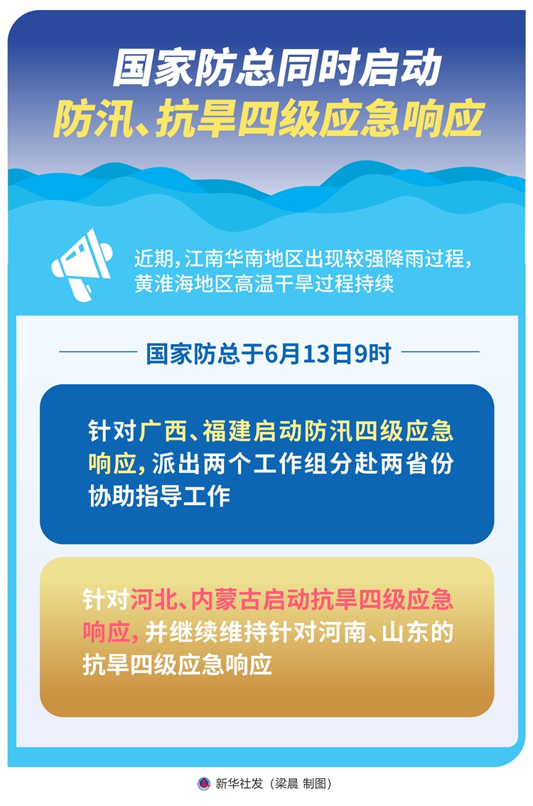 近期,江南華南地區出現較強降雨過程,黃淮海地區高溫干旱過程持續。國家防總于6月13日9時針對廣西、福建啟動防汛四級應急響應,派出兩個工作組分赴兩省份協助指導工作;針對河北、內蒙古啟動抗旱四級應急響應,并繼續維持針對河南、山東的抗旱四級應急響應。
