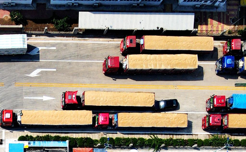 6月15日,在山東省臨沂市平邑縣一處糧食儲備庫夏糧收購現場,運輸車輛排隊售糧(無人機照片)。新華社發(武紀全 攝)