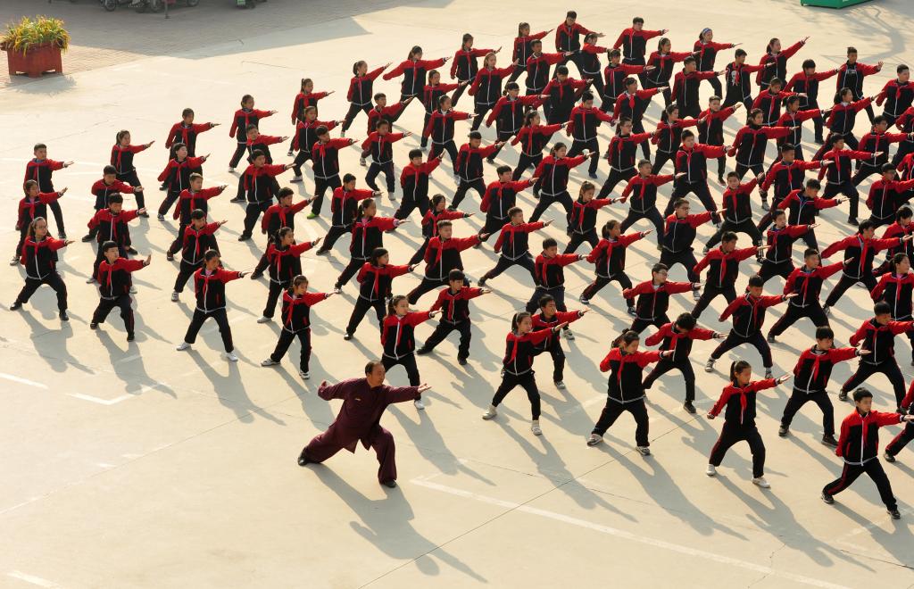 2020年11月19日,六合拳傳承人石同鼎(下)在河北滄州泊頭西關回民小學帶領學生們練習六合拳。