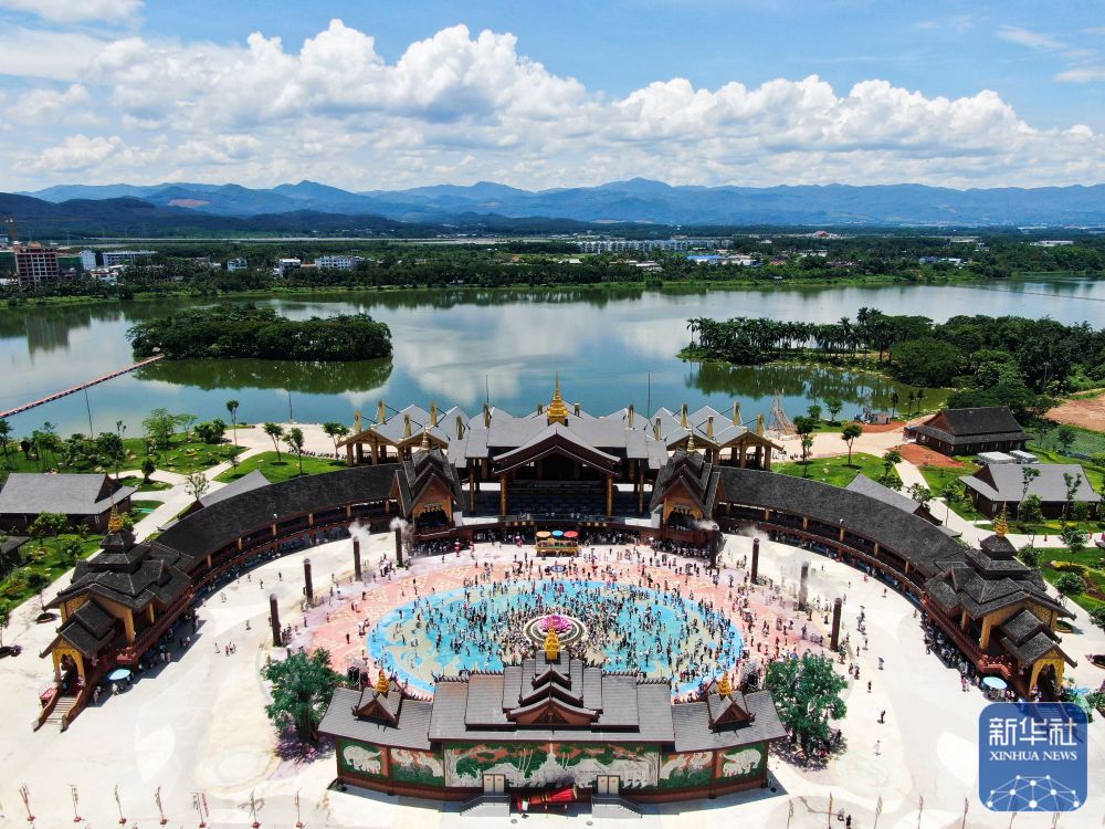 在云南省西雙版納傣族園景區(qū)內(nèi)的傳統(tǒng)傣寨曼聽村,游客參加潑水狂歡活動(無人機(jī)照片,7月7日攝)。新華社發(fā)(李云生 攝)