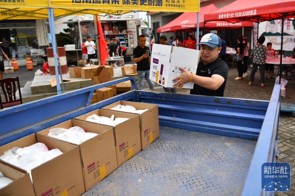 7月10日,在岳陽市良心堡鎮望君洲村,志愿者在打包盒飯。新華社記者 陳振海 攝