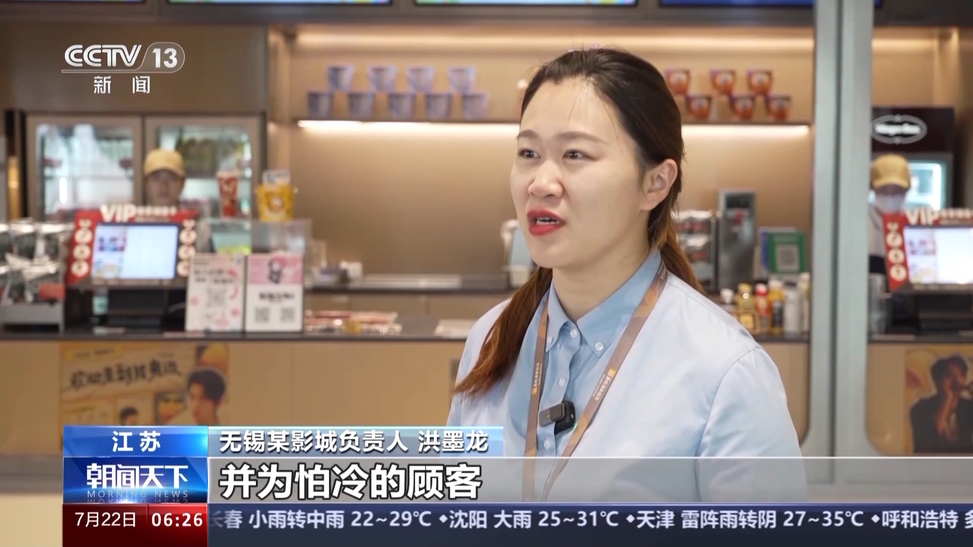 無錫某影城負責人 洪墨龍:首先我們保證影廳的溫度適宜,并為怕冷的顧客提供免費干凈的毛毯。我們還會通過現(xiàn)場的陳列布置,打造主題觀影氛圍,讓觀眾在觀影過程中有更多的參與感和互動體驗。