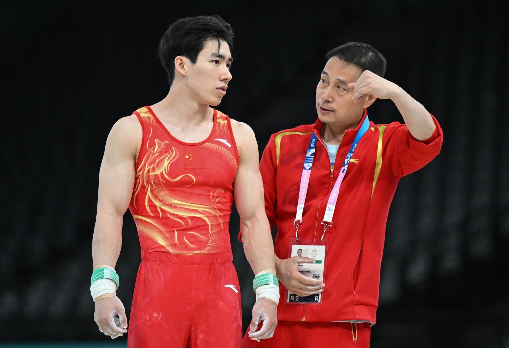 7月24日,中國男子體操隊在巴黎進行賽臺訓練,中國隊選手張博恒(左)在準備吊環項目訓練。新華社記者 程敏 攝