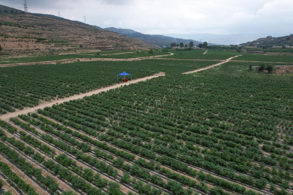 這是在天水市甘谷縣新興鎮侯家溝村拍攝的辣椒生產基地(無人機照片)。新華社記者 范培珅 攝