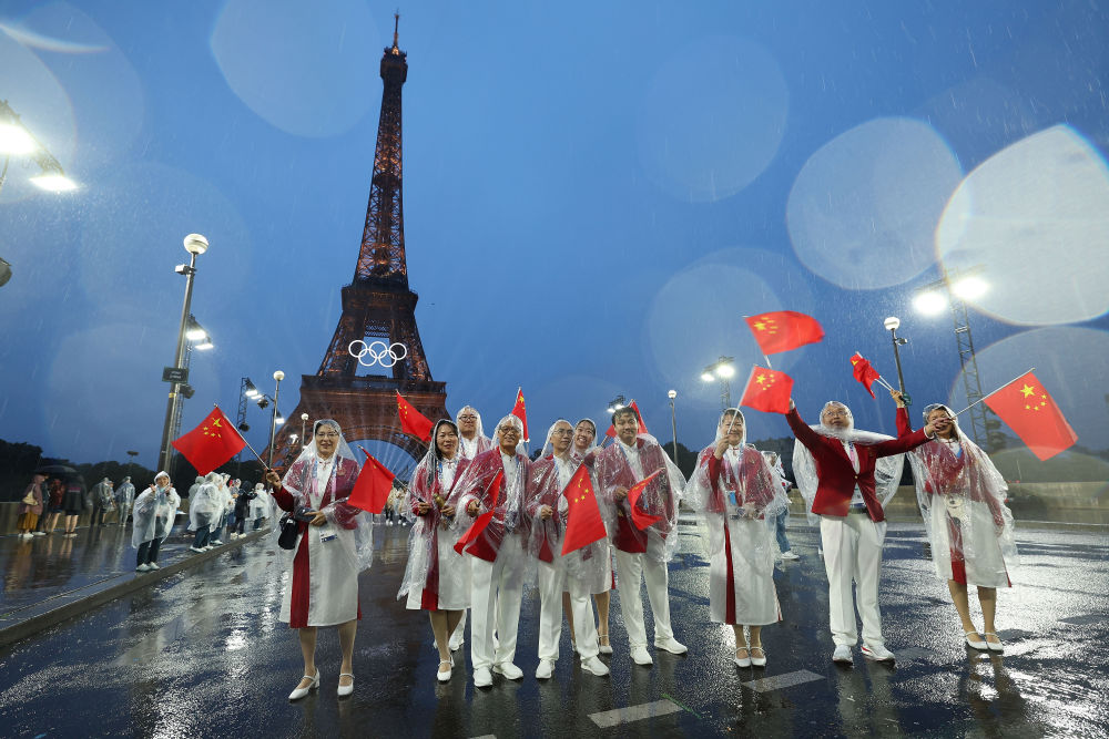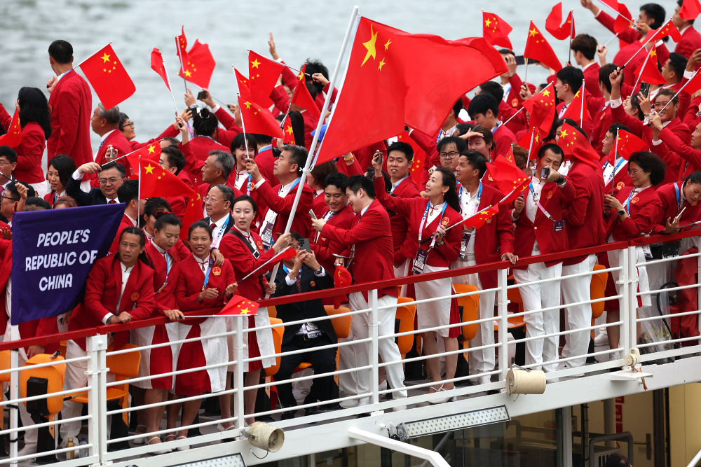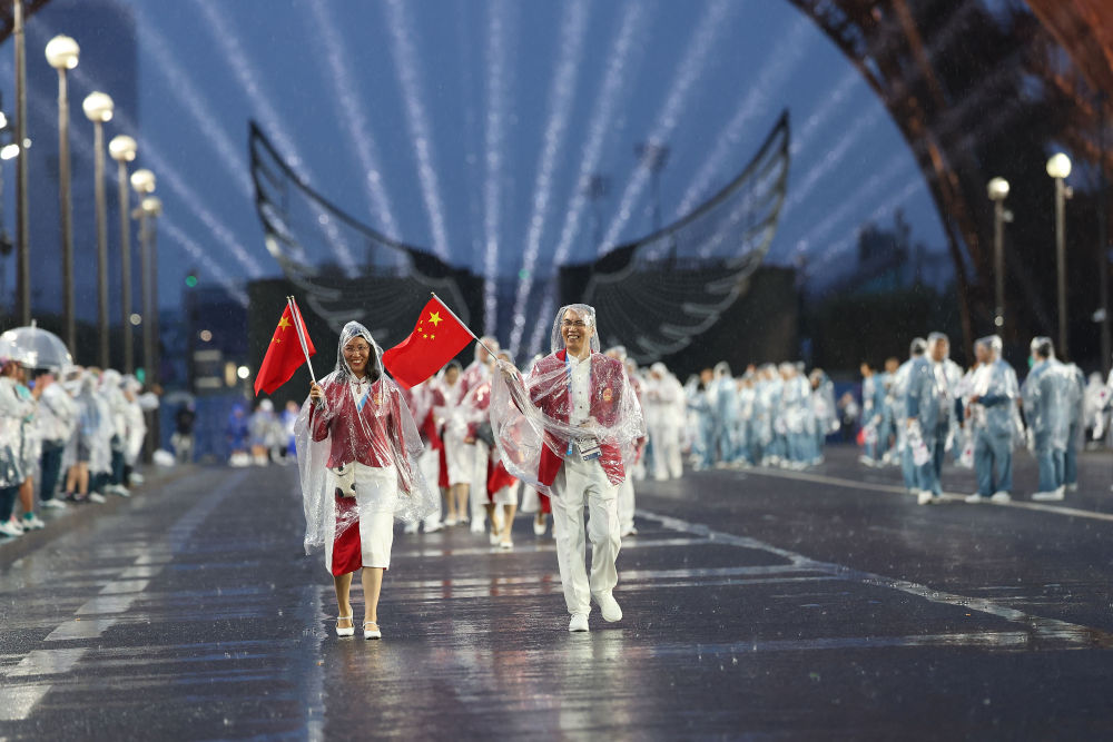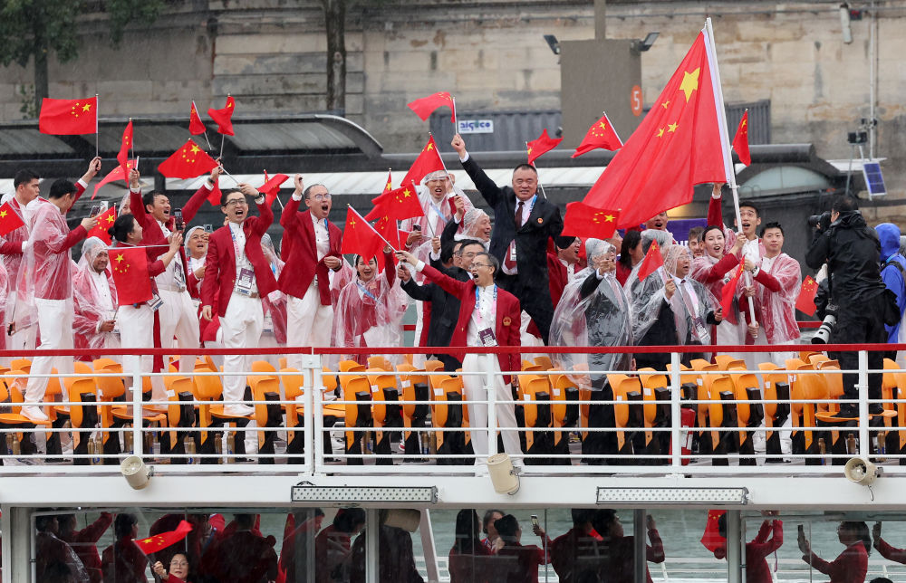當地時間7月26日,第33屆夏季奧林匹克運動會開幕式在法國巴黎舉行。乒乓球運動員馬龍、花樣游泳運動員馮雨高擎五星紅旗,中國體育代表團運動員乘船在塞納河巡游。