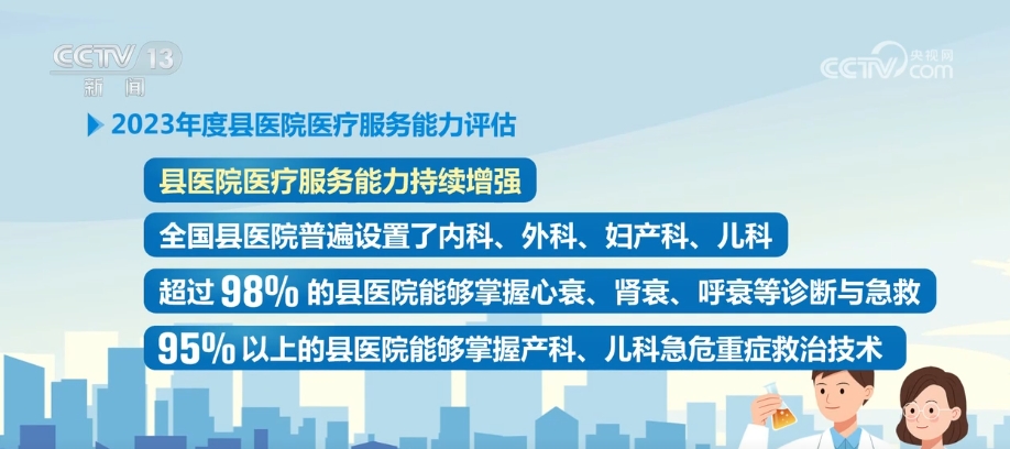 央視網消息:國家衛生健康委29日通報了2023年度縣醫院醫療服務能力評估情況,全國共有2062家縣醫院參與醫療服務能力第三方評估,縣域覆蓋率達到98.6%。評估顯示,全國有91.85%的縣醫院符合基本標準,也就是相當于達到二級醫院能力,其中符合推薦標準達到三級醫院能力的占比超過一半。