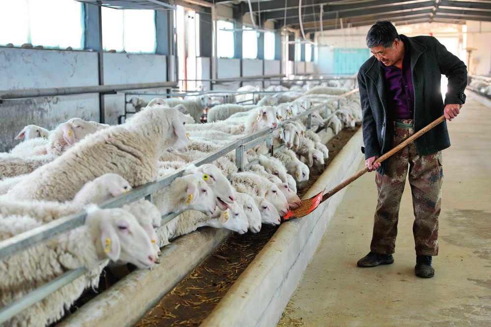 山西省朔州市右玉縣張千戶嶺養殖專業合作社的工作人員王吉在喂羊(資料照片)原勛攝/《瞭望》