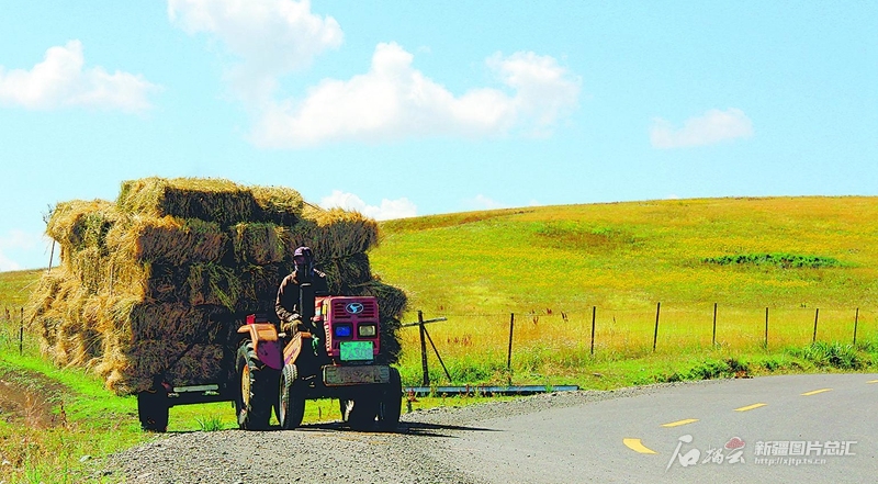 8月8日,位于裕民縣巴爾魯克山區的阿克喬克草原,牧民駕駛拖拉機拉運草料。近年來,該縣通過對農村公路升級改造,優化了城鄉公路網,為農牧民出行、農作物運輸提供更多便利條件。 楊化光攝