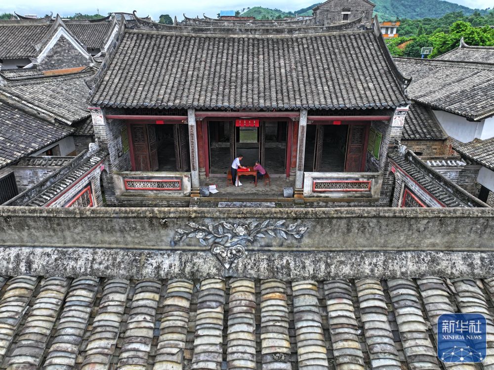 8月15日,楹聯愛好者在大蘆村古宅里寫對聯(無人機照片)。